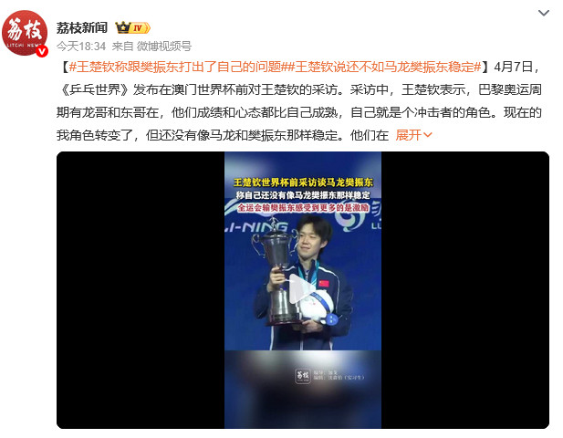 4月7日,《乒乓世界》发布在澳门世界杯前对王楚钦的采访。采访中,王楚钦表示,巴黎奥运周期有龙哥和东哥在,他们成绩和心态都比自己成熟,自己就是个冲击者的角色。现在的我角色转变了,但还没有像马龙和樊振东那样稳定。他们在中国队承担起的责任和带给我们的精神支持,一直是自己想达到的目标,自己也正在努力向着那个更好的方向去进步。